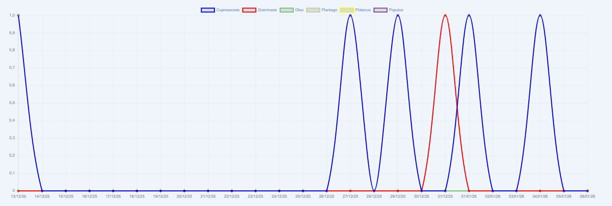 Recuento de polen en Salamanca Semana del 12 al 18 de enero: Gramíneas: nada Olivo: nada Arizónica: nada Aliso: nada Chopo: nada Platanero: nada Plantago: nada Resumen del últimos meses (Fuente: SEAIC, www.polenes.com)