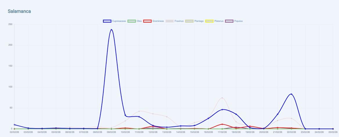 Recuento de polen en Salamanca Semana del 23 de febrero a 1 de marzo: Gramíneas: cero Olivo: cero Arizónica: moderado Aliso: cero Chopo: bajo Platanero: cero Plantago: cero Resumen del últimos meses (Fuente: SEAIC, www.polenes.com)